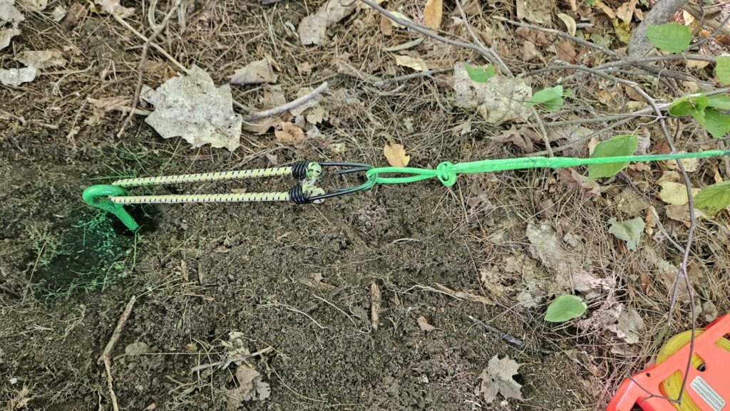 At the lower anchor points I combined both safety and camo. I used some neon green paint to mark the anchors and lower ends of the lines. From a distance you can’t make it out, but when your near it, you can. This helps avoid tripping while keeping in low viz.