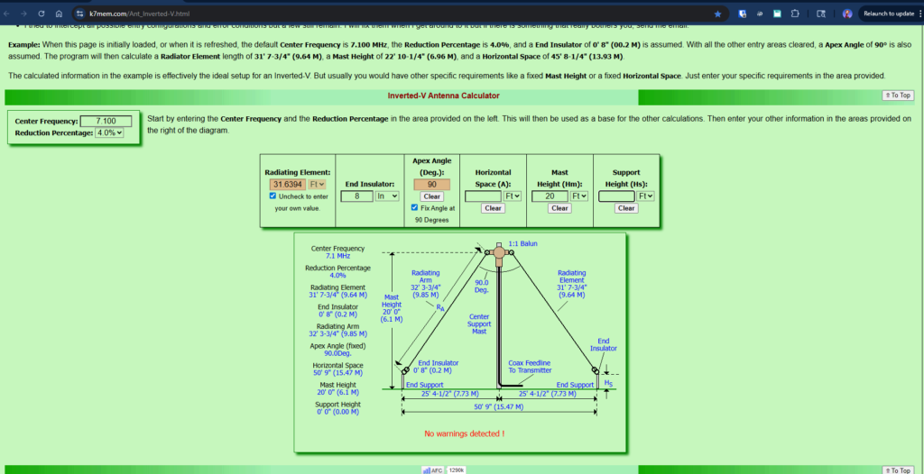 Big shout out to k7mem for his inverted V antenna calculator at https://k7mem.com/Ant_Inverted-V.html. This provides multiple dimensions for your leg lengths, height, counterpoises, and other things for your given frequency.